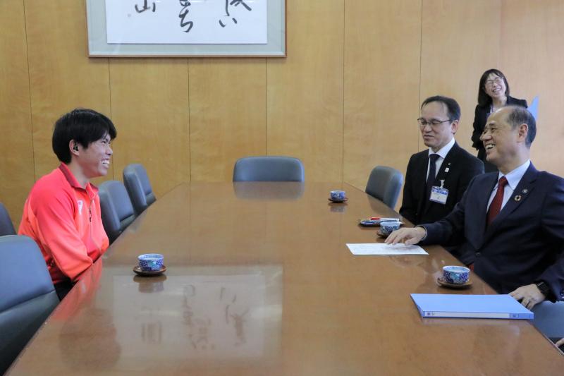 受到了众多职员的热烈欢迎,在之后的拜访中,石本同学对大森市长表示了感谢“谢谢大家的支持”,同时也谈及到虽然很开心,但也留下了遗憾结果以及决赛中的失误等,坦率地表达了感想。此外,在教育实习的话题中,大森市长说:“如果有机会看到实际的选手、运动员,学生们一定会很高兴。”除此之外,大家还聊起了跨栏比赛等话题,气氛十分融洽。