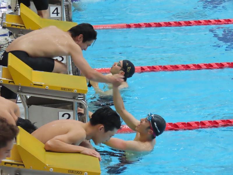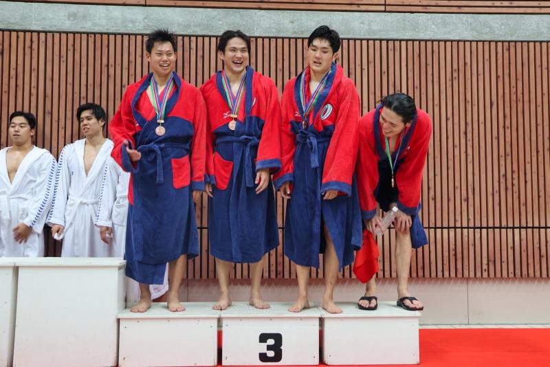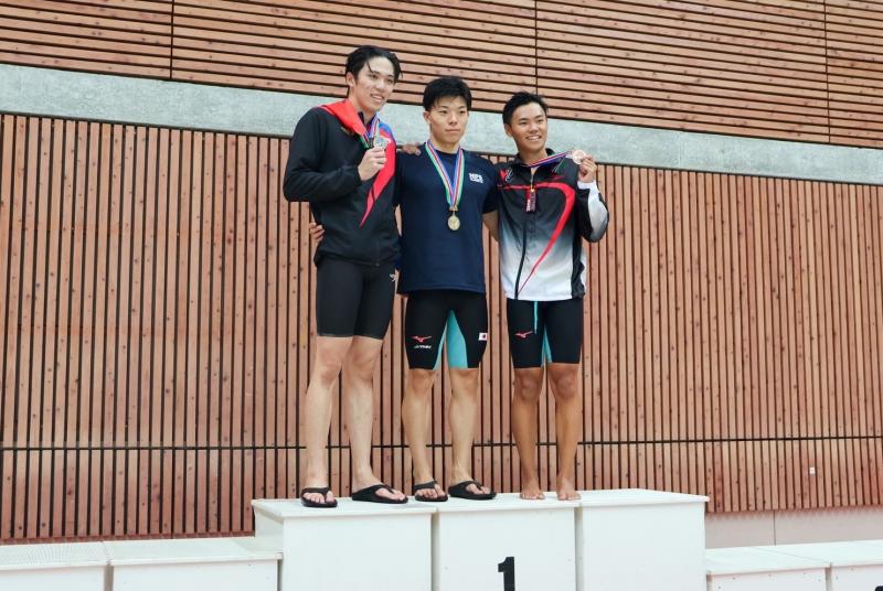 In addition, the men's 4×100-meter freestyle relay team of TAKEUCHI Yuto (4th year, School of Agriculture), YANAGI Haruki (4th year, School of Science), KASATANI Yuto (2nd year, School of Economics), and MURAKAMI Taichi earned third place.
