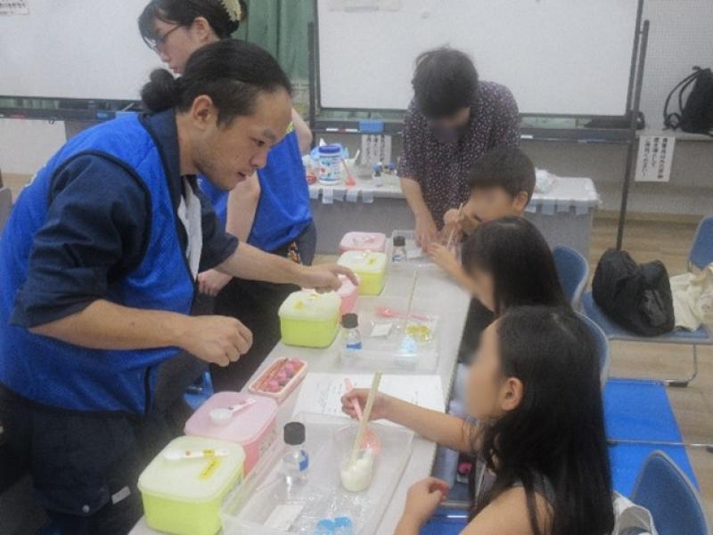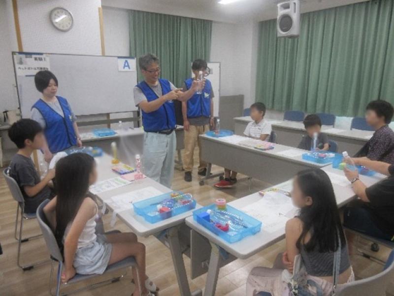 実験教室には、事前に申し込みがあった17人の小学校高学年の児童と、その家族が参加。「ペットボトル万華鏡を作ろう」、「クロマトアートでしおりを作ろう」、「入浴剤を作ろう」の3つのテーマを、グループに分かれて順番に体験しました。