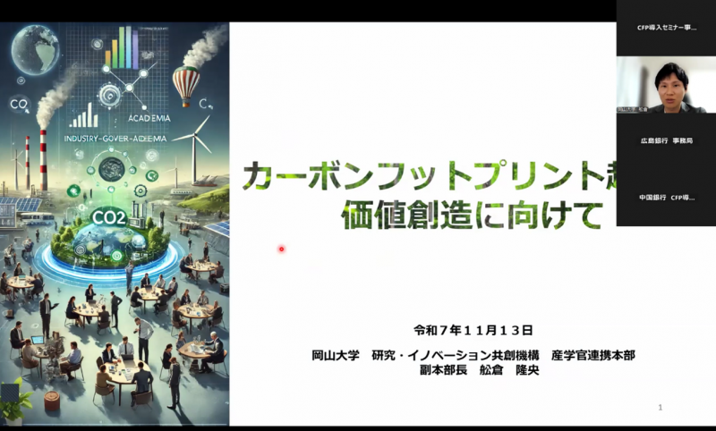 株式会社ちゅうぎんフィナンシャルグループおよび株式会社ひろぎんホールディングスは、山陽地域におけるサステナビリティ推進の強化を目的として、両社が3月28日に締結した「山陽地域のサステナビリティ推進に向けたパートナーシップ協定」に基づき、このたび「カーボンフットプリント(CFP)算定に関する人財育成プログラム」を共同で立ち上げました。本プログラムには本学がアドバイザーとして協力しており、本学からは学術研究院社会文化科学学域の天王寺谷達将准教授および研究・イノベーション共創機構産学官連携本部の舩倉隆央副本部長が参画しています。地域ぐるみでの脱炭素化を金融面から支える人材の育成に、大学として学術的知見を提供する新たな取り組みが始まりました。