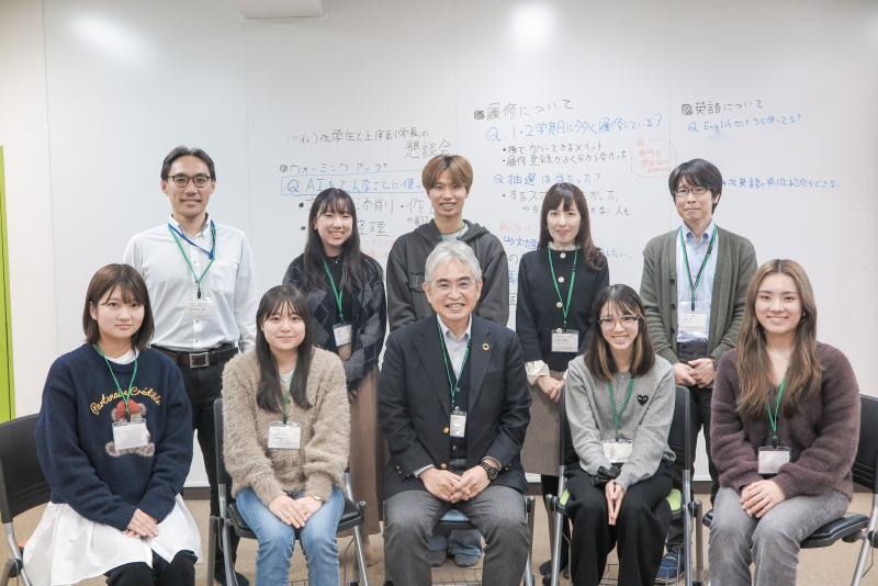 本学では、高等学校の新学習指導要領における「主体的・対話的で深い学び」の視点で学習した高校生の状況を先取りした教育改革に取り組んでいます。懇談会では、2025年度から展開している新しい学士課程教育をテーマに、その一期生である1年生と意見交換を行いました。