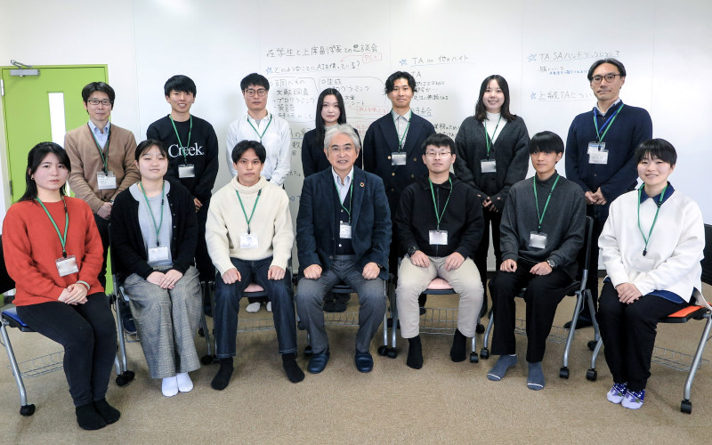 本学は1月15日に、2025年12月の学部生に続き、大学院生と菅誠治理事(教学担当)・上席副学長との懇談会を開催し、TA(Teaching Assistant)をテーマとして、業務の実態や経験から得たことなどについて、TA経験のある大学院生11人と意見交換を行いました。この懇談会は、本学における教育をよりよいものとするために、在学生と上席副学長が直接対話し、新たな視点や課題を共有することを目的として企画・開催しています。