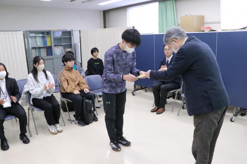 表彰式では、岩﨑良章保健管理部門長(学術研究院教育研究マネジメント領域・教授)から表彰状が、後援・協賛の加藤弘樹岡山大学生活協同組合専務理事から賞品が授与されました。