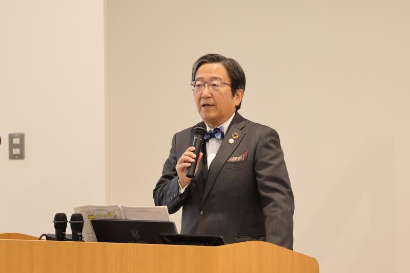 冒頭の那須保友学長の開会あいさつに続いて、佐藤法仁副理事・副学長・総合技術部本部長・上級URAがSXプラットフォームについて説明しました。講演では、わが国の研究基盤を支える研究機器に焦点を当て、他国より研究環境が悪化傾向にあることを踏まえ、研究機器の「買う」から「借りる」への行動変容によって、研究力強化や人材育成といったメリットに加え、わが国の研究機器メーカーの研究開発力強化にもつながることなどに言及しました。