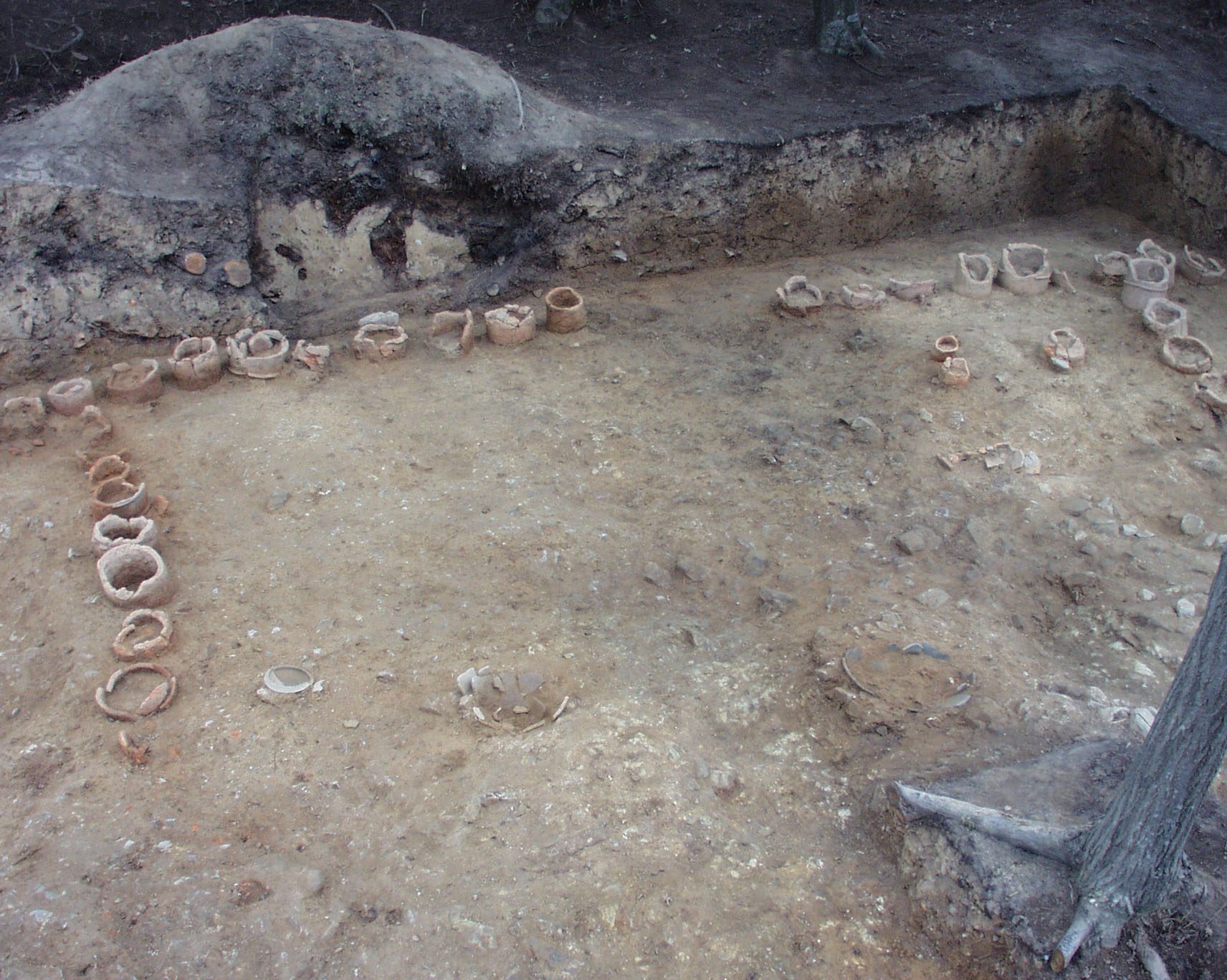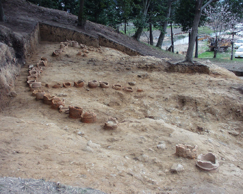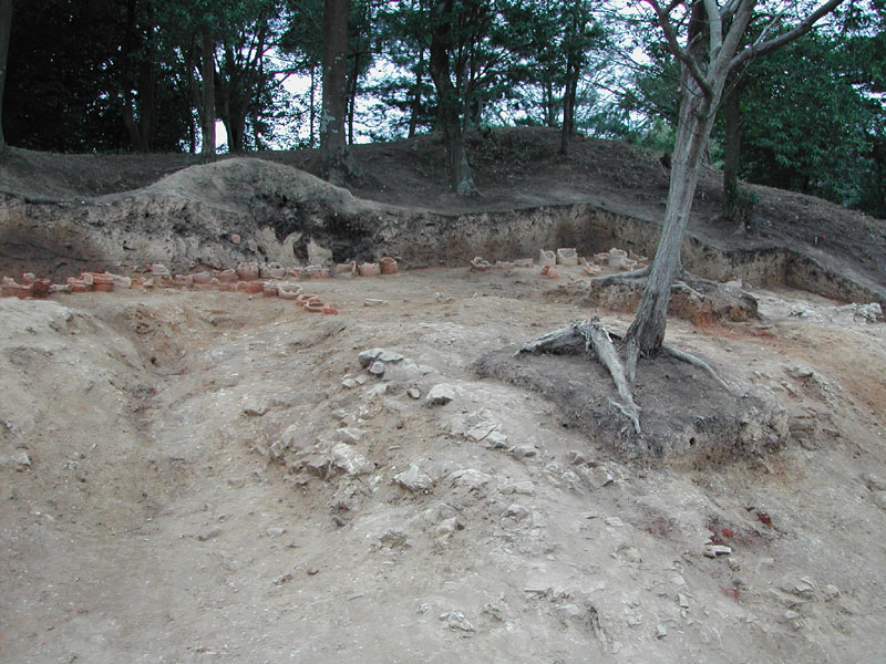 形象埴輪は主に北くびれ部トレンチで、昨年度と同様に家形埴輪と人物埴輪を確認している。家形埴輪は昨年出土したものと接合し、平長約40p、妻幅約29pを測る。外面にタテハケを施し、平側には透かし孔の一部が確認できる。原位置を保つと思われる出土状況から、平を東西方向に据えていたと考えられる。