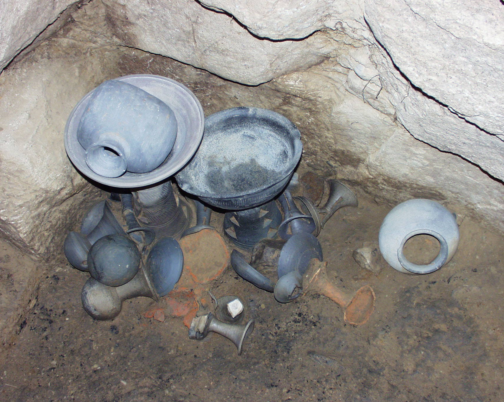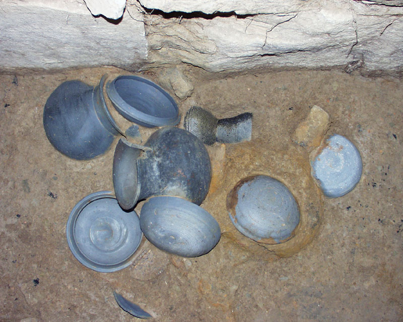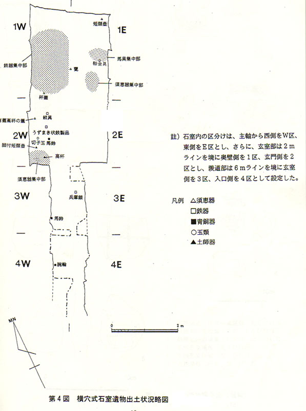 土器は、完形の須恵器数点の集中が1Eの玄室の中央寄りと、2Wの玄室袖部に見られる。1Eの集中部では杯身、杯蓋、壺、広口壺の完形を含む須恵器6点が出土した。2Wの集中部では杯身、杯蓋、高杯、●、短頸壺、広口壺、横瓶、器台の完形を含む須恵器16点が出土した。2Wの集中部にはその他に土師器の脚付短頸壺と高杯、金属製品も見られる。集中部以外では1Wの主軸沿いに大型の甕が、1Wの側壁側から杯蓋が、1E奥壁側から短頸壺が、2Wの側壁側から有蓋高杯の蓋がそれぞれ出土している。