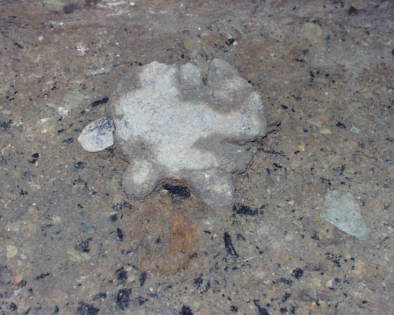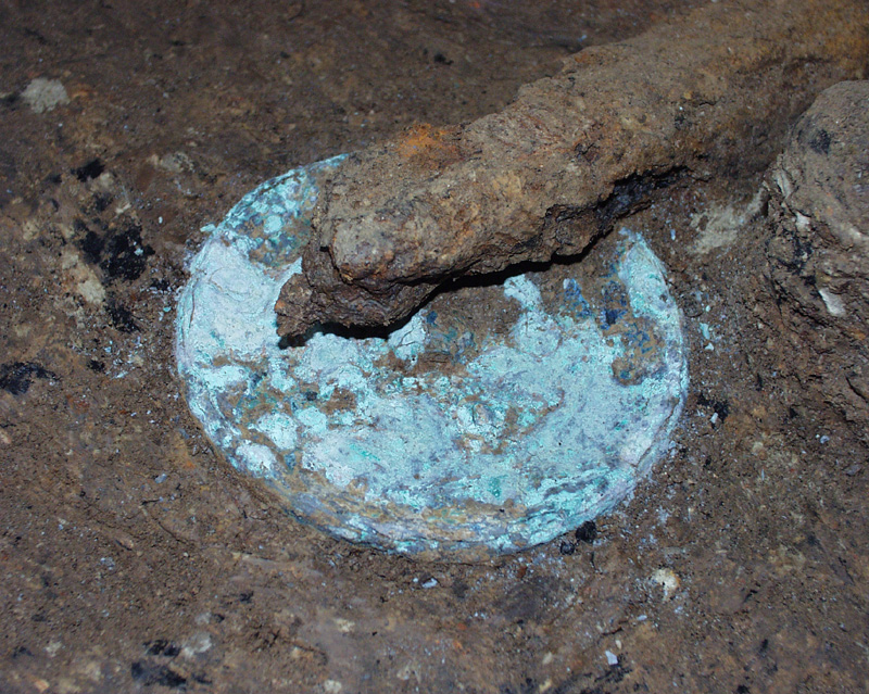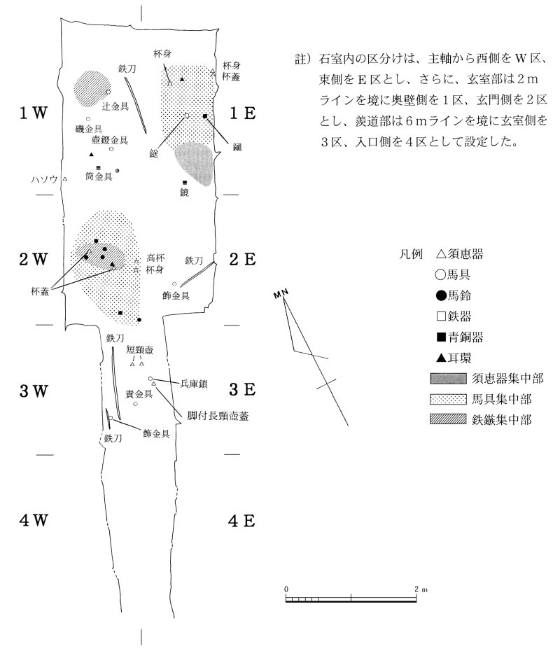 金属製品では鉄鏃、馬具が石室全体から多く出土している。鉄鏃は1W側壁側、2W玄室中央寄りから集中して出土している。1Wでは向きがある程度揃った状態で、2Wでは不規則な向きで、鉄鏃がそれぞれ積み重なって出土している。また、馬具は1E、2Wから集中して出土している。1Eでは剣菱形杏葉、轡、ホ具、?などが出土し、1E須恵器集中部と同じく、昨年度調査の集中部と一連のものと考えられる。2Wでは馬鈴、雲珠、壺鐙金具、剣菱形杏葉、辻金具、ホ具、?、責金具などが出土している。これら以外で馬具は1Wから馬鈴、壺鐙金具、辻金具、磯金具、2Eから飾金具、3Wから飾金具、責金具、3Eから兵庫鎖が出土している。馬鈴は大型のものが2W玄門付近から1点、小型のものが1W玄室中央付近から1点、2Wから5点がそれぞれ出土している。その他、鉄製品として石室全体から鉄釘、1E中央から鎹が出土している。また、鉄刀は1W主軸沿いから1点、2E中央から1点、3W側壁側から2点がそれぞれ出土している。青銅製品は1E玄室中央付近から鏡、1E側壁側から?と思われる金具、1W玄室中央付近から筒金具が出土している。