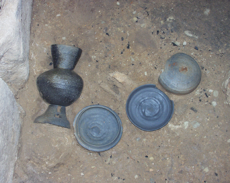 土器は、須恵器が1Eの玄室中央寄りから集中して出土している。1Eでは杯身、杯蓋、脚付長頸壺、●を含む須恵器6点が出土しており、これは昨年度の調査における1Eの須恵器集中部と一連のものと考えられる。その他では1W側壁側から●、1E側壁側から杯身、杯蓋、2Wから杯身、杯蓋、高杯、3区主軸沿いから短頸壺、脚付長頸壺の蓋がそれぞれ出土している。このうち2Wのものは昨年度の調査における2W須恵器集中部の周辺部にあたる。土師器は破片のみが石室全体から少量出土している。