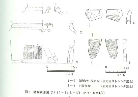 今回の調査では約500点の埴輪片が出土しており、大部分は前方部Bトレンチからの出土である。いずれも小片で、全形を窺いうる資料はない。現在のところ、円筒埴輪と朝顔形円筒埴輪が確認でき、円筒埴輪片が大部分を占める。