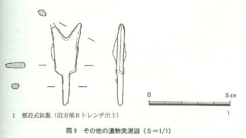 前方部Aトレンチから出土した縦型の石匙は、ほぼ完形で長さ4cm幅1.7cmである。石材にはサヌカイトが用いられている。前方部Bトレンチから出土した雁股式鉄鏃は切先の一部が破損しているがほぼ完形である。二股部は抉りが浅く、ほとんど開かない。鏃身関部をしっかりとつくりだしている。類例に乏しく、現在までのところ時期不明である。また、前方部Aトレンチからは瓦質祠の棟部の破片が出土している。