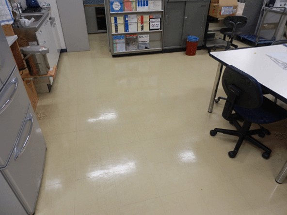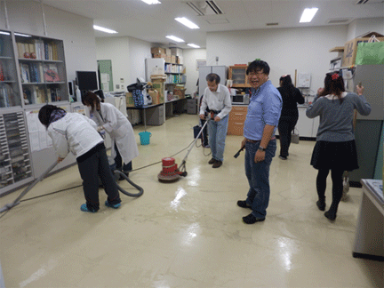机の下までしっかりと・・・。こびりついた床の汚れもガシガシと・・・。朝から始まった大掃除ですが、見事なチームワークと勢いで、昼頃にはだいぶ片付いていました。床面はワックスを塗って仕上げました。