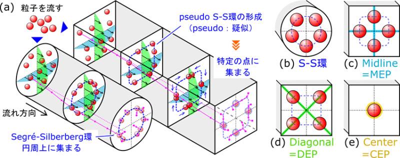 大阪大学研究生院基础工学研究科广畑佑真(博士后期课程)、杉山和靖教授(理化学研究所光量子工学研究中心客座研究员兼任)、关西大学系统理工学部关真佐子教授、板野智昭教授、佐井一总(硕士课程(当时))、丹下祐希(硕士课程(当时))、西山朋宏(硕士课程)、冈山大学学术研究院环境生命自然科学域铃木大介教授、凑遥香讲师(特任)等研究小组明确了微流道内粒子的聚焦模式会随着粒子的惯性和变形性发生戏剧性的变化。实验证明,较硬颗粒聚集在流道壁附近,而较软水凝胶颗粒聚集在流道截面的中心或对角线上。
