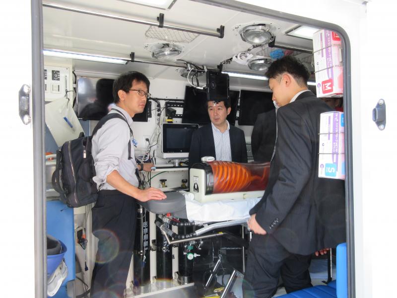 その後、櫻井副病院長の案内のもと、岡山大学病院のオープンイノベーションプログラムであるBIZENのラボやドクターカーを見学。現場に根ざした実践的な取り組みを紹介しました。