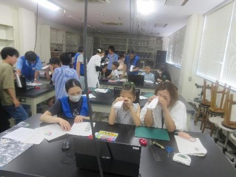 当日は、総合技術部の田村義彦部長の実験教室についての説明で始まり、参加者はそれぞれのテーマに分かれて実験に取り組みました。「スペクトル分光器を作ろう」では、はじめに講師の技術職員が、光のスペクトルとは何か、スペクトル分光器の作り方などを説明。子どもたちははさみやカッターナイフを使って台紙から分光器のパーツを切り出し、光を分けるための回折格子、波長を測るスケールなどを貼り付け、箱型に組み立てました。さらに色を塗ったり絵を描いたりして、自分だけの分光器を完成させました。最後に完成した分光器で、自然光、白熱灯、蛍光灯、LEDライトなどの白色の光や、ノートPCに表示させたさまざまな色を観察しました。子どもたちは、白い光が虹色に分かれるのを見て驚き、光の色の観察を楽しんでいました。
