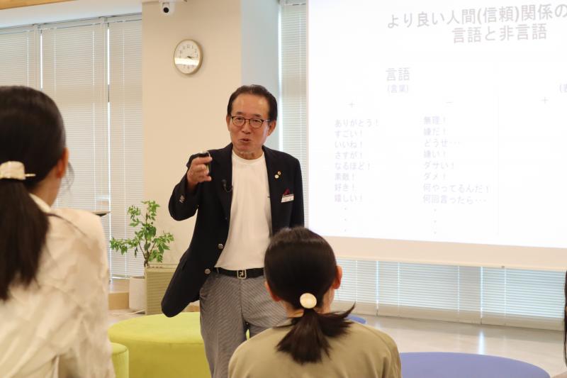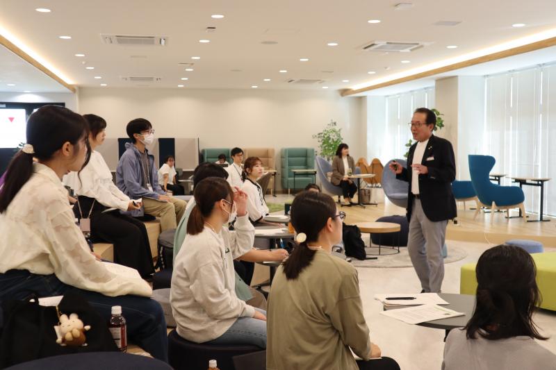 続くグループワークでは、参加者が向かい合って並び、「やりたいことが何でも叶えられる状況になったら、何がしたいか」といった問いをもとに、自身の上質世界(個人の基本的欲求を満たす物、人、状況、信条などのイメージが収められた、脳内の理想の世界)について考え、意見を交わしました。堀江氏は「何をしたいかを明確にもっており、それに向かってどれだけ努力できるか、出し切れるかが大事だ。みんなその能力を持っているから、まずは今日1日実行してほしい」とエールを送りました。