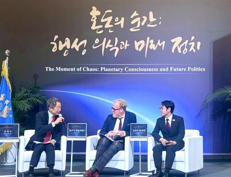会議は、キム・ウォンス氏(慶熙大学ミウォン平和研究所高級顧問、未来文明院長)の司会のもと、ほかにグロ・ハーレム・ブルントラント氏(ノルウェー初の女性首相、The Elders 創設メンバー)、ポール・シュリバスタワ氏(ローマクラブ共同代表)、アリスター・ファーニー氏(The Elders 最高経営責任者)、トーマス・セドラチェク氏(ヴァーツラフ・ハヴェル図書館 館長)、ジョルジー・サボ氏(ユビキタス大学 大学院長、ラズロ新パラダイム研究所元事務局長)らも登壇。マーヘル・ナッサー氏(国連事務次長補)およびミリアン・ヴィレラ氏(地球憲章国際本部(Earth Charter International)事務局長)からはビデオメッセージが寄せられました。 横井副学長は講演において、現代の危機を、単なる技術的・政治的な問題ではなく、人類の世界観と倫理のあり方に根ざした文明全体の課題として位置づけました。具体的には、気候正義や将来世代への責任、そして人類と地球の共存と双方のウェルビーイングを共創することの重要性を強く訴え、大学はこうした時代的な要請に応えるべく、正義と責任を育む教育変革の場であるべきだと力強く強調しました。会場では聴講していた学生を含む多くの参加者から質問が寄せられ、このテーマに対する国際的関心の高まりと共鳴の広がりが鮮明に示されました。
