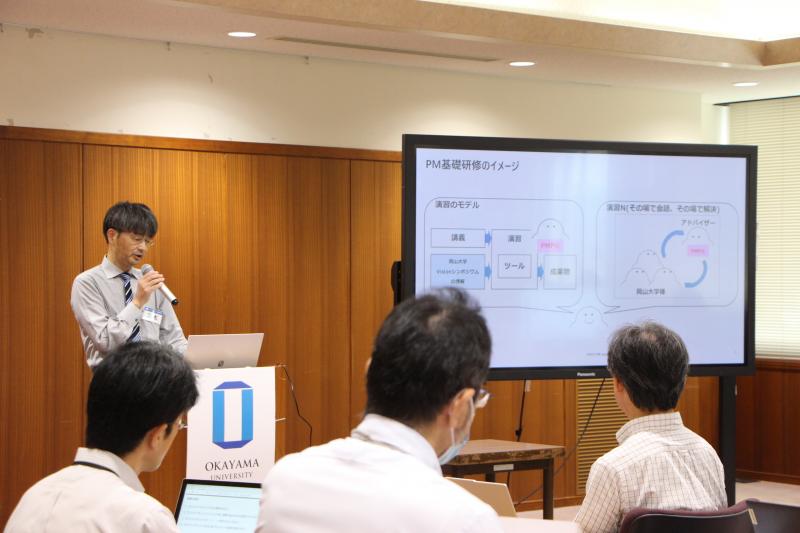 導入研修は、「岡山大学Vision シンポジウム」という仮の企画を題材にPMの手法を学び、実際の開催業務に応用することを通じて、より実践的な成果を得るための研修プログラムを3回開催します。第1回である今回は、PMI日本支部から藤井新吾副会長と組織拡大委員会でPM基礎研修プログラムを担当する石塚幸夫リーダー、鳥本明男サブリーダーらが来学し、講師を担当しました。