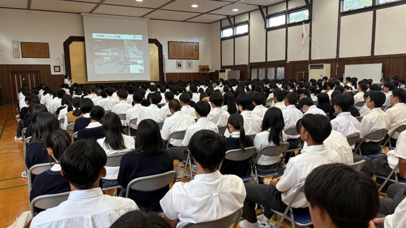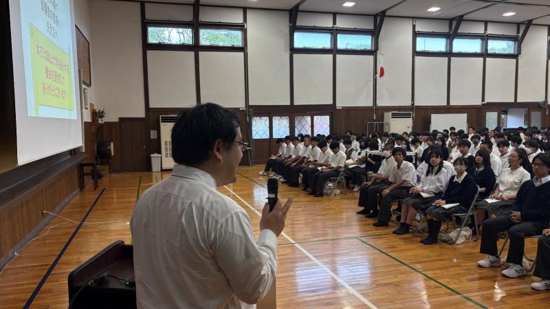 10月3日、本学は岡山学芸館高等学校にて、高校1年生と保護者を対象とした岡山大学工学部の説明会を実施しました。当日は、300人を超える生徒・教職員と保護者が参加しました。本説明会は、文系・理系の選択を控える高校1年生とその保護者に向け、理系学部の実際の学びを伝え、より広い進路選択の一助とすることを目的に開催したものです。