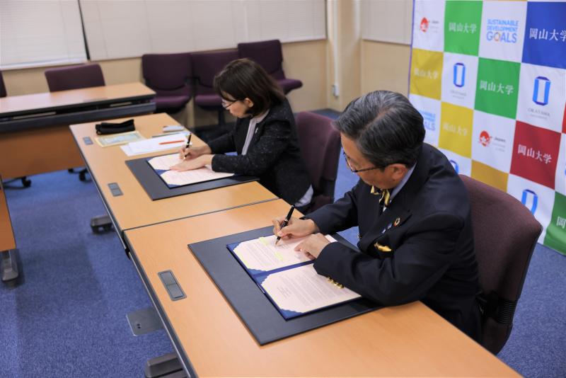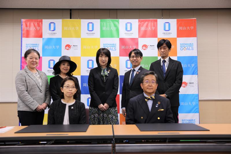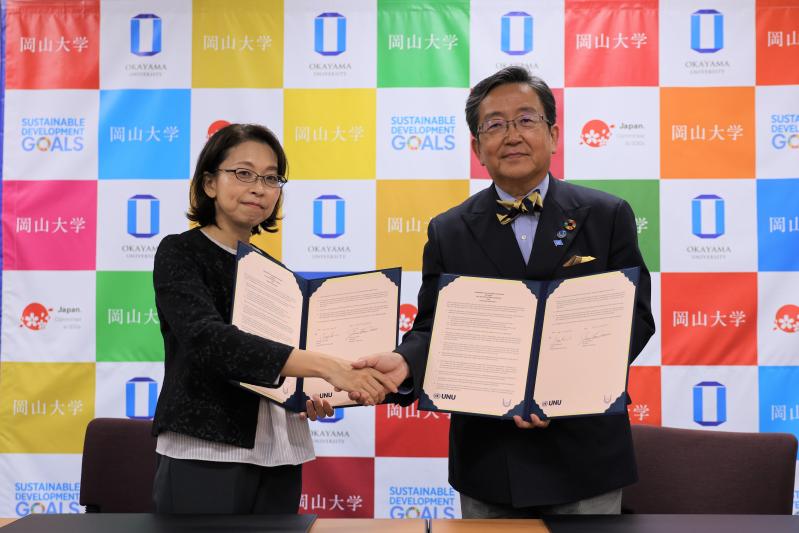 10月20日、岡山大学において、本学と国際連合大学(国連大学)との国際交流協定(MoU)の調印式を行いました。鈴木綾国連大学上級副学長と那須保友学長が協定書に署名し、国連大学から山口しのぶサステイナビリティ高等研究所(UNU-IAS)所長、堀尾多香同大学院プログラム事務局長、本学から三村由香里理事(企画・評価・総務担当)、横井篤文副学長(グローバル・エンゲージメント担当)が同席しました。