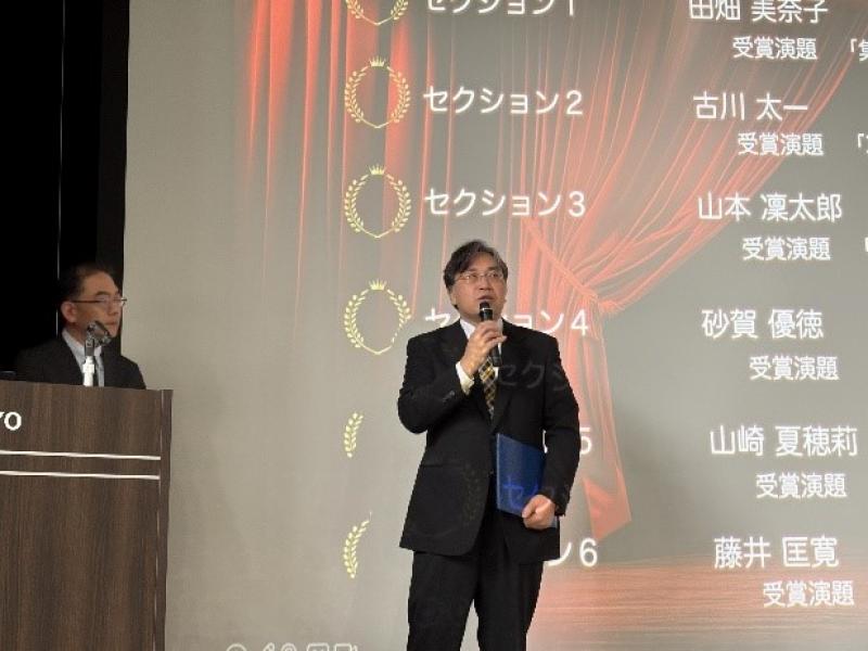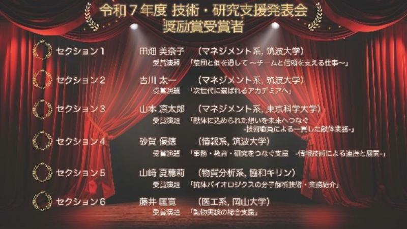 本発表会は技術力と研究支援力の可視化やプレゼンテーションスキルを向上させること、多様な専門分野から新たな知見の獲得や他機関との連携を醸成することなどを目的としており、令和7年度入学者28人が発表を行いました。藤井技術専門職員は「動物実験の総合支援」と題して、これまでに携わった研究支援活動や今後の展望について発表し、優れた発表をした6人のうちの1人に選出されました。なお、同発表会では令和4年度に設計制作・社会基盤技術課の堀格郎課長が日本電子賞を、令和6年度には教育支援技術課の中村有里技術専門職員がTCカレッジ賞を受賞しています。