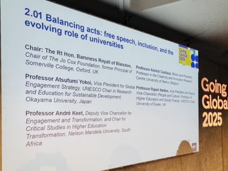 10月28~30日、英国政府の国際交流機関ブリティッシュ・カウンシルが主催する、英国最大の高等教育の国際化に関する国際会議「Going Global London 2025」に横井篤文副学長(グローバル・エンゲージメント担当)が出席し、併せて、公式セッション “Balancing Acts: free speech, inclusion, and the evolving role of universities” のパネルディスカッションに登壇しました。