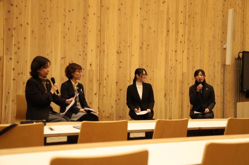 また、パネルディスカッションでは、「工学系女子が少ないのはなぜ?どうすれば増える?」をテーマに、総合技術部の中村有里技術専門職員を交えた3人の登壇者による議論を行いました。進路選択の際に工学部を選んだきっかけをはじめ、大学での研究内容、入職後から現在に至るまでの経験、職場における多様性などについて、活発な意見交換がなされました。