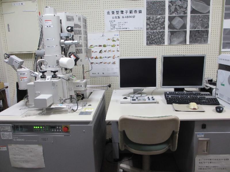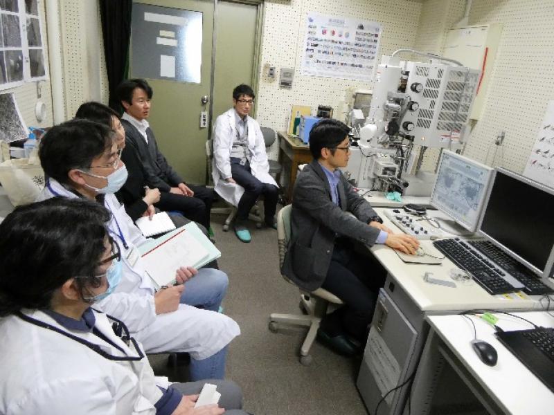 実習は、本学医学部共同実験室に設置している走査型電子顕微鏡「HITACHI S-4800」を使用して行いました。検出器や加速電圧等の条件設定を変更した時の実際の像を比較することで、検出器による電顕像の違いや像障害を軽減するための方法について、実機での確認をしました。その他、機器の使用法やさまざまな便利機能についての説明もありました。