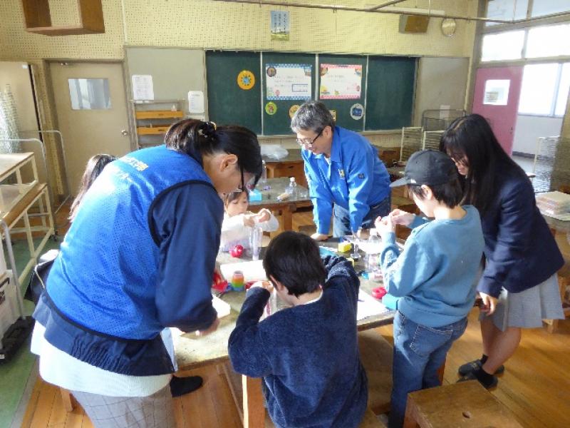 総合技術部からは「ペットボトルで万華鏡を作ろう!」、「クロマトアートでしおりを作ろう!」、「入浴剤を作ろう!」、「冷え冷えスライムを作ろう」の4テーマを出展し、18人の参加者がそれぞれのテーマを順番に回り全てのテーマを体験しました。また岡山県立岡山城東高等学校の生徒7人がボランティアで出前実験に協力。参加者が安全に科学実験を行えるよう補助しました。参加した子どもたちは、身近な科学に驚いたり喜んだりしながら、友達と一緒に工夫して取り組んでいました。