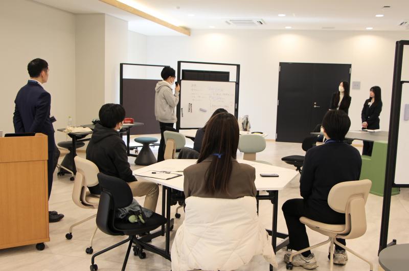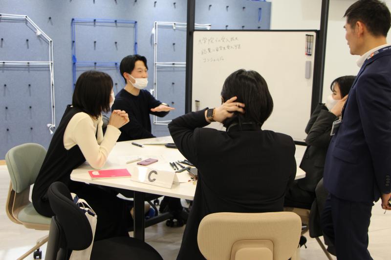 報告会第二部では、会場参加者と発表者が3つのグループに分かれ、今後の留学生リクルート等における本学の課題を考えるワークショップを行いました。仁井主任専門職員がファシリテーターとなり、発表者を中心に各グループで留学生リクルート等における本学の抱える課題について活発な議論が行われました。第二部の最後には、挙げられた課題について各グループ代表者から発表し、森本由美子人事課長から所感と閉会のあいさつがありました。