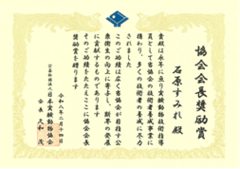 本賞は、同協会が認定している実験動物技術指導員を対象に、教育・認定事業において貢献した実験動物技術指導員を表彰するものです。今年度は、同協会の「実験動物技術指導員表彰規程」に基づき15人の実験動物技術指導員が受賞しました。
