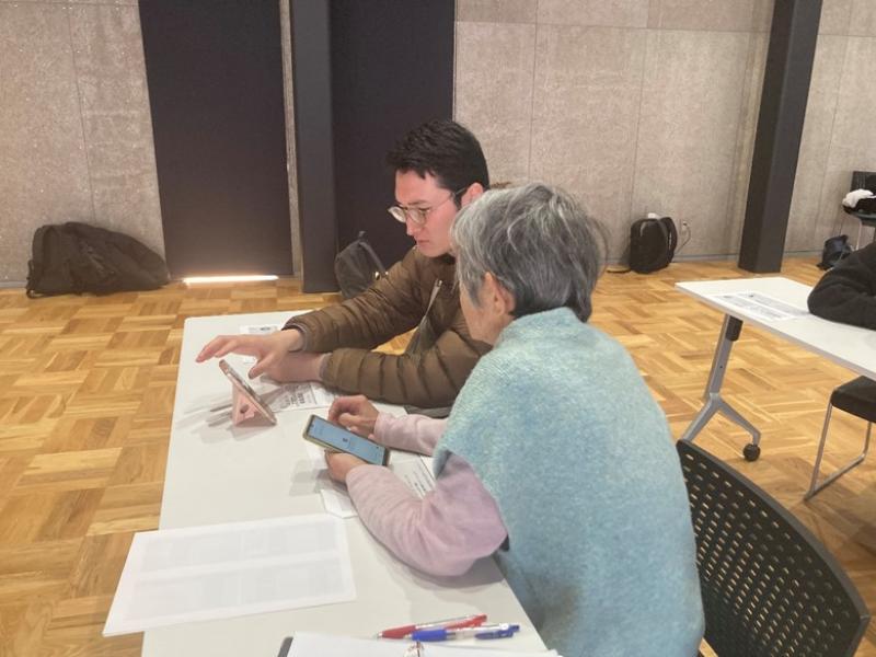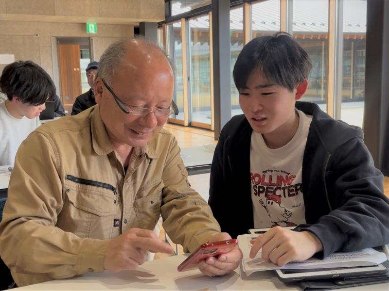 21日午前に実施した「スマホ×AI体験講座」には、7人の町民が参加しました。同講座は、学生が参加者一人ひとりの隣に座り、スマートフォンの基本操作から生成AI「ChatGPT」の活用方法までを丁寧に伝えるハンズオン形式の講座を行いました。