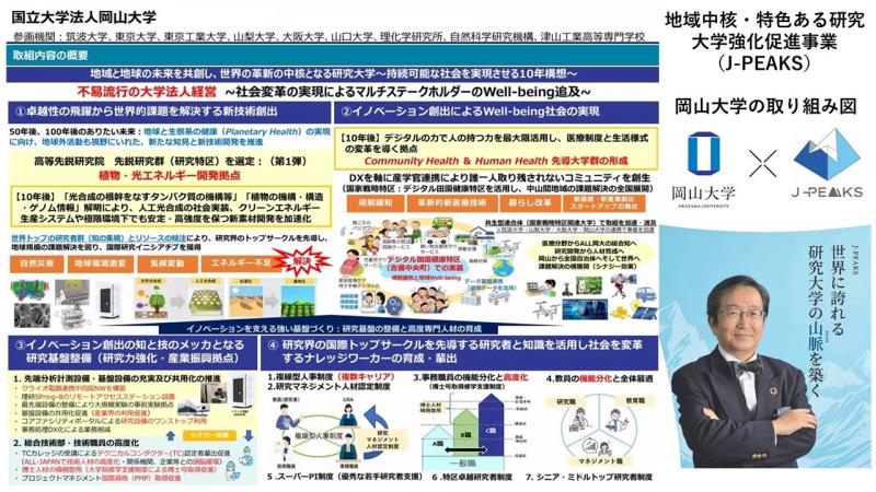 ・文部科学省「地域中核・特色ある研究大学強化促進事業(J-PEAKS)」に採択~地域と地球の未来を共創し、世界の革新の中核となる研究大学:岡山大学の実現を加速とともに世界に誇れる我が国の研究大学の山脈を築く~
