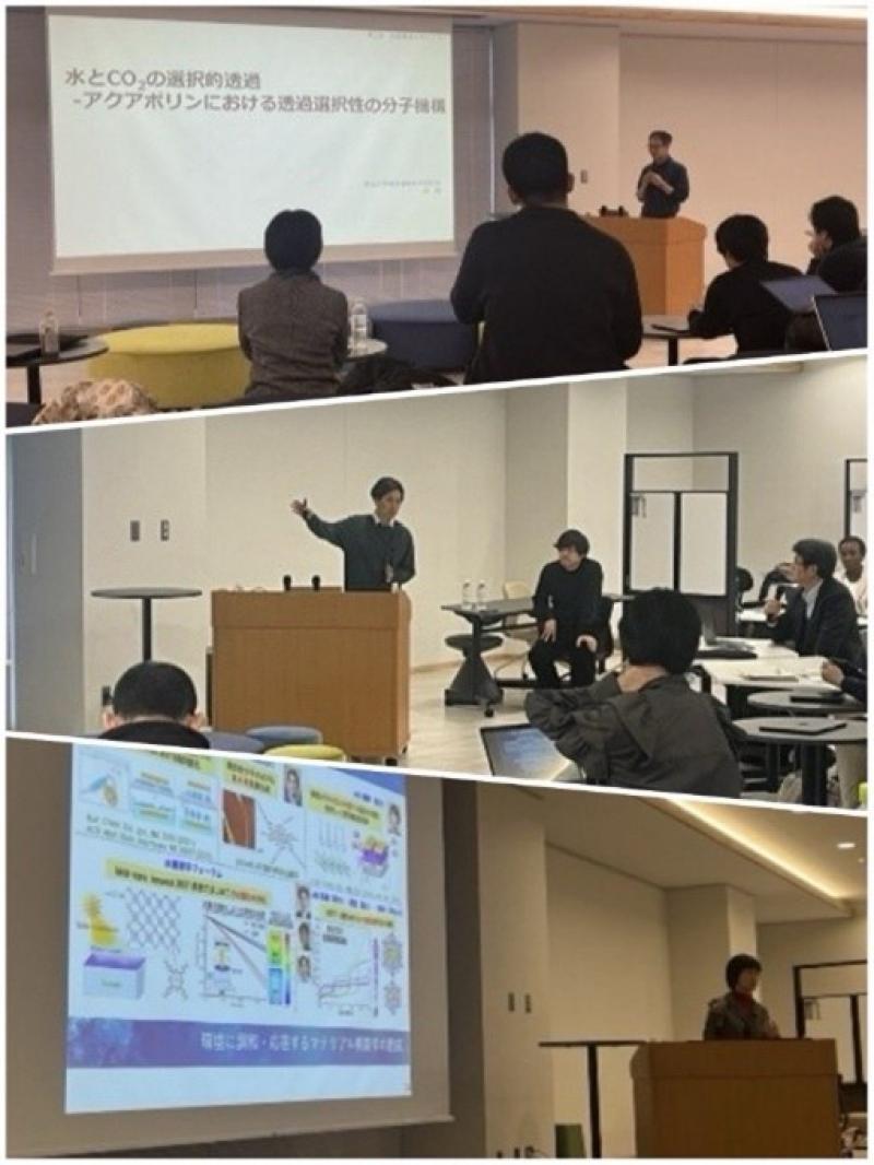 続いて行われた研究講演では、本学資源植物科学研究所の森泉准教授、本学環境生命自然科学学域の福田伸子教授、東北大学大学院工学研究科の牧浦理恵教授の3人の研究者が登壇し、それぞれの研究成果を紹介しました。森准教授は、水とCO₂の選択的透過に関わるアクアポリンの分子機構について、福田教授はプラズモニクスの水環境科学への応用可能性について、牧浦教授は水圏界面を利用した多孔性錯体MOFナノシートの創製とその機能開拓について講演しました。会場では、参加者からの質問も寄せられ、研究内容や今後の展開について活発な議論が行われました。セミナー終了後には、同施設にて交流会も開催され、参加者同士が研究内容や今後の連携の可能性について意見を交わしました。