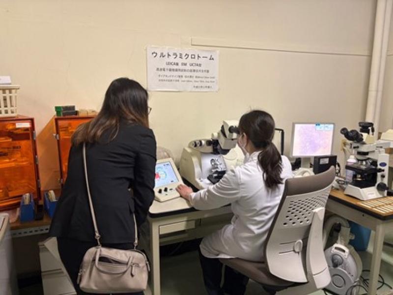 本学総合技術部では、大阪大学・部局横断型女性技術職員ネットワークと「親子で遊ぼう!女技の夏休みオンラインサイエンス」(例年夏に同ネットワークが主催)に2021年度から参画し、交流を深めています。小中学生に焦点を当てた科学啓発活動や広報活動にも注力している本学総合技術部の地域貢献ワーキンググループの女性技術職員らとも意見交換ミーティングを実施し、お互いの知見や意見交換を行いました。また、医学部共同実験室で電子顕微鏡を担当する塚野萌美技術主任へのインタビューも行いました。さらに、本学の定例記者発表の準備から発表までを見学。5DLab.では、映像技術の秘訣などについても熱心に質問していました。