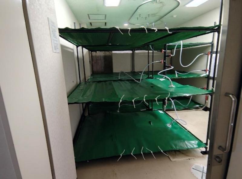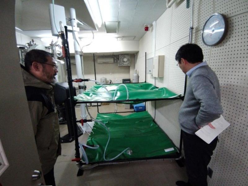 各機関には、岡山大学が事前にヘリウムガス回収用圧縮機1台とヘリウムガス回収用ガスバッグ(1㎥)10個を納品しており、当日は、NMR装置とガスバッグを専用のホース等で接続する作業や回収用圧縮機の試運転等を行った後、NMR装置からガスバッグへのヘリウムガスの回収を開始しました。