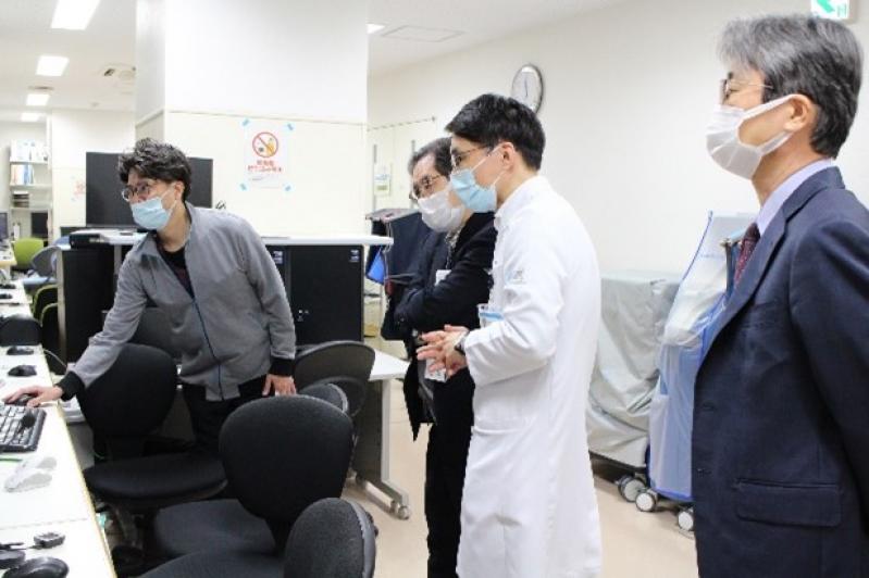 その後、鹿田キャンパスへ移動し、岡山大学病院を訪問。前田嘉信病院長らと面談を行いました。前田病院長から病院の経営状況について説明を受けた後、院内のIVRセンターおよびICU・CICUの集中治療室を視察しました。IVRセンターではIVR-CT室を訪れ、放射線科医師から、画像ガイド下で行う凍結療法について説明を受けるなど、先進的な医療技術への理解を深める機会を得ました。またICUでは、看護師長から医療設備や運用体制について説明を受けるとともに、小児の先天性心疾患患者の病床も視察し、本院における高度で専門的な医療提供体制を確認されました。