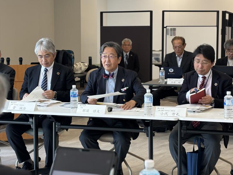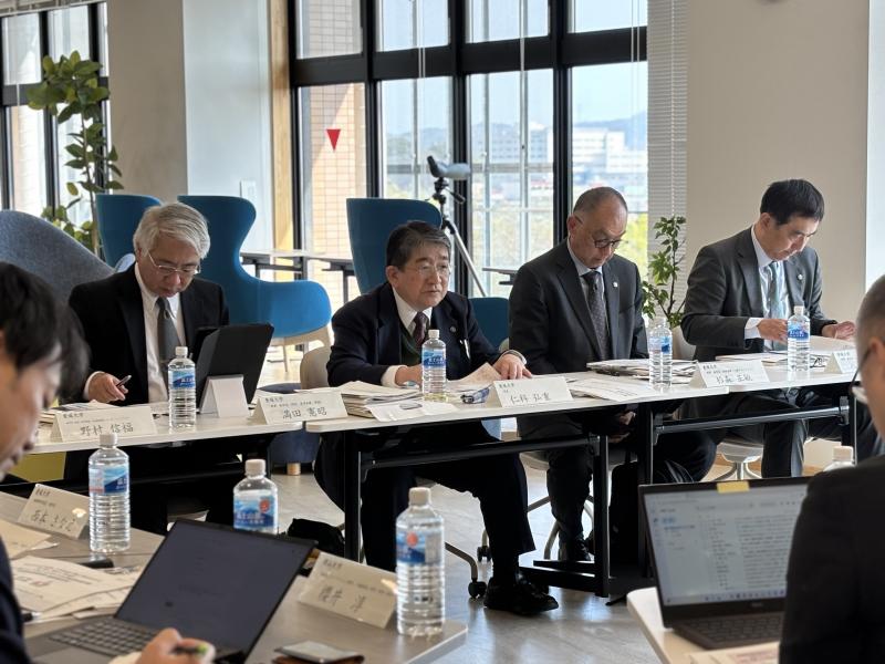 愛媛大学の仁科弘重学長らが4月3日、本学津島キャンパスを訪問し、KIBINOVEにおいて意見交換を行いました。今回の意見交換会には、愛媛大から仁科学長、杉森正敏理事・副学長、満田憲昭理事・副学長、八尋秀典理事・副学長、野村信福副学長らが参加し、本学からは那須保友学長をはじめ、関係理事・副理事・本部長等が出席しました。