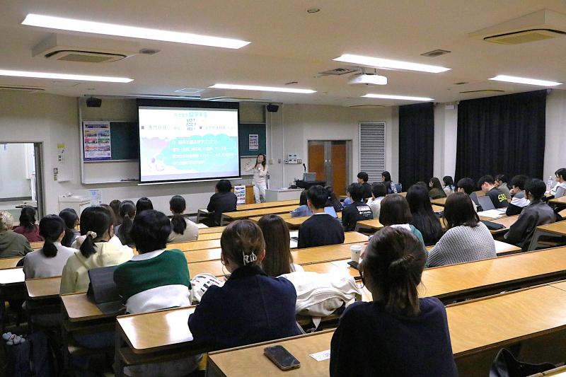 海外留学全体説明会では、グローバル人材育成院 海外留学(派遣)担当の大林純子・学術研究院共通教育・グローバル領域准教授が、留学の意義や時期、留学の選択肢、各種支援制度について説明し、「Challenge-Explore-Grow ― 留学しよう」というメッセージとともに、学生一人ひとりの挑戦を後押ししました。さらに、文系・理系それぞれの留学経験者による体験発表や留学準備デスクの紹介も行われ、実体験に基づく言葉といきいきとした姿が、参加者の心に響いた様子でした。