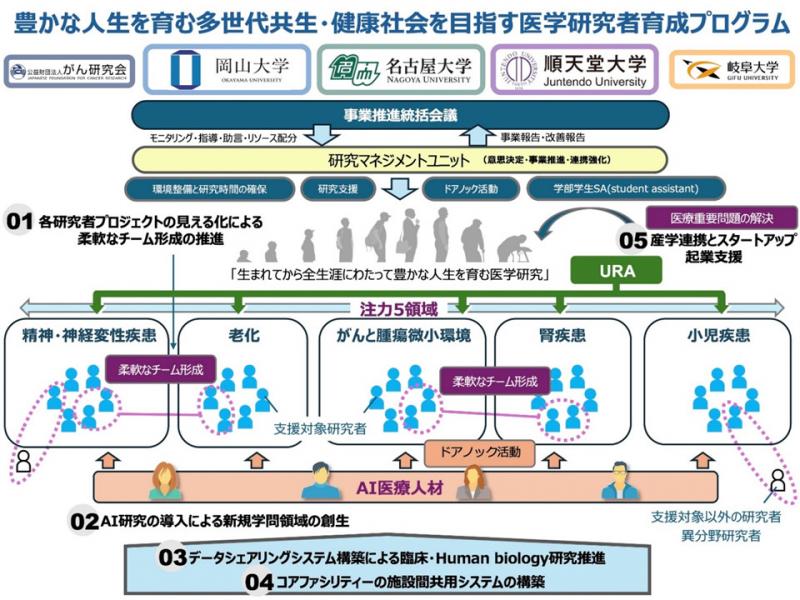 国立大学法人東海国立大学機構 名古屋大学、国立大学法人 岡山大学、学校法人順天堂 順天堂大学が共同で提案した「豊かな人生を育む多世代共生・健康社会を目指す医学研究者育成プログラム」が、令和7年度 文部科学省・日本医療研究開発機構(AMED)「医学系研究支援プログラム」【特色型】に採択されました。