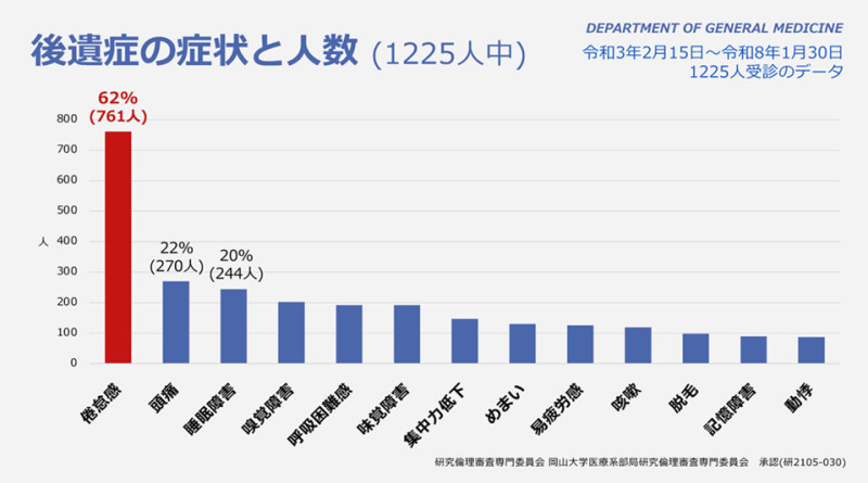 岡山大学病院総合内科・総合診療科(学術研究院医歯薬学域・大塚文男教授)が、2021年2月15日に国内の総合病院として全国で2番目に開設した「コロナ・アフターケア外来」は、今年で開設5年を迎えました。当時は新型コロナウイルス感染症の急性期流行の最中であり、後遺症の全体像は不透明で、診療現場も手探りの状況でした。この間、本外来では診療チームで約1300人の患者さんの診療にあたり、臨床データの蓄積と病態解明に向けた研究を並行して進めました。開設から5年が経過した現在までの症例の蓄積を通じて、症状の特徴や経過、治療の方向性などについて一定の知見が得られてきましたが、長期化するケースも見られるため、県外の後遺症診療施設とも診療ネットワークを通じた情報交換を継続しています。今回、開設5年を節目として、これまでの診療実績と5年間で見えてきたコロナ後遺症の実像を取りまとめました。
