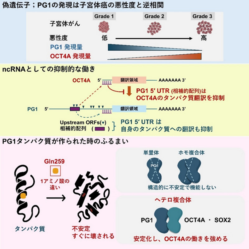 - ヒトの幹細胞やがんで重要な役割を果たす遺伝子「POU5F1(OCT4)」と、その鏡像のような存在である偽遺伝子「POU5F1P1(PG1)」の複雑な関係を明らかにしました。