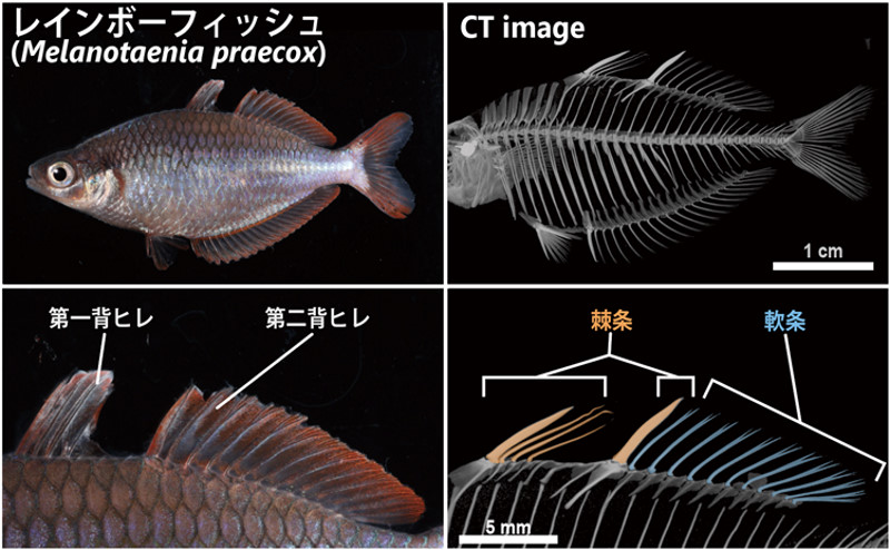 - 「棘条」の形成時には、通常のヒレ骨格で成長をガイドする棒状コラーゲンに依存しないことを、レインボーフィッシュを用いた実験から発見。