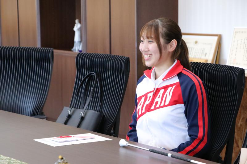前田さんは金メダルとバトンを持参し、大会の様子や出場までの過程などについて報告しました。那須学長と菅理事からの「評価ポイントはどんな点ですか?」、「将来、指導者になりたい気持ちがあるのですか?」といった質問に、前田さんは「バトンは技の難易度に加え、正確さ、綺麗さ、表現力などをトータルして評価されます」、「現在も通っている教室で幼児や小学生に教えており、私自身が大会に出場しなくなってからもバトンに関わることができればいいなと思うことがあります」と答え、世界大会ならではの他言語に触れた感想などさまざまな経験について語りました。