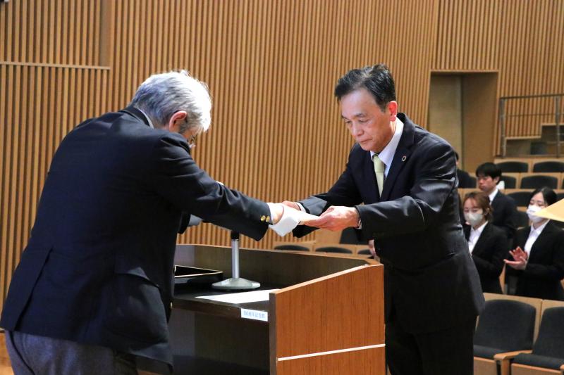 表彰式では菅誠治理事(教学担当)・上席副学長が各賞の代表者に表彰状を授与し、ボランティア・コーチの方々に長年にわたる指導への謝辞を述べるとともに、学生の受賞者には、日頃の勉学や課外活動の成果に対して敬意を表すると祝辞を述べました。