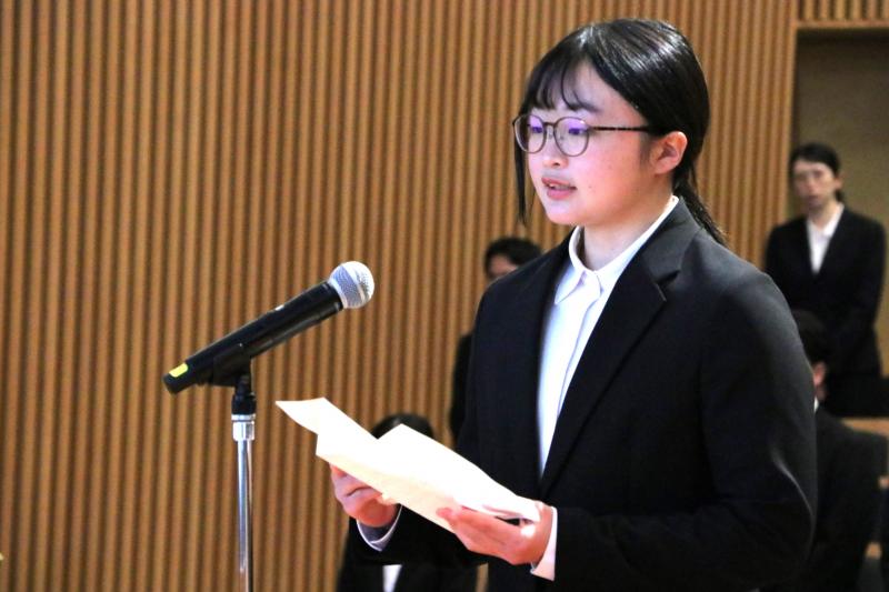 受賞者からは、弓道部でボランティア・コーチを務める難波伸次さん、「日本物理学会 第80回年次大会」で「学生優秀発表賞」を受賞した生熊清さん(大学院環境生命自然科学研究科博士後期課程1年)、そして「第52回全日本学生パワーリフティング選手権大会」女子63kg超級で優勝したウェイトトレーニング部の大西咲綺さん(文学部4年)が、代表して謝辞を述べました。