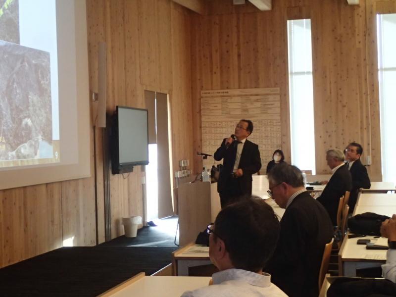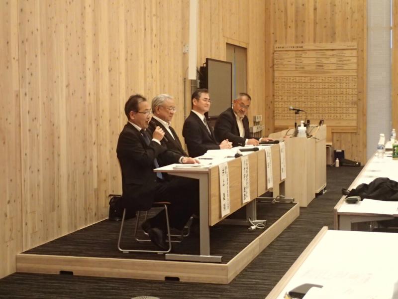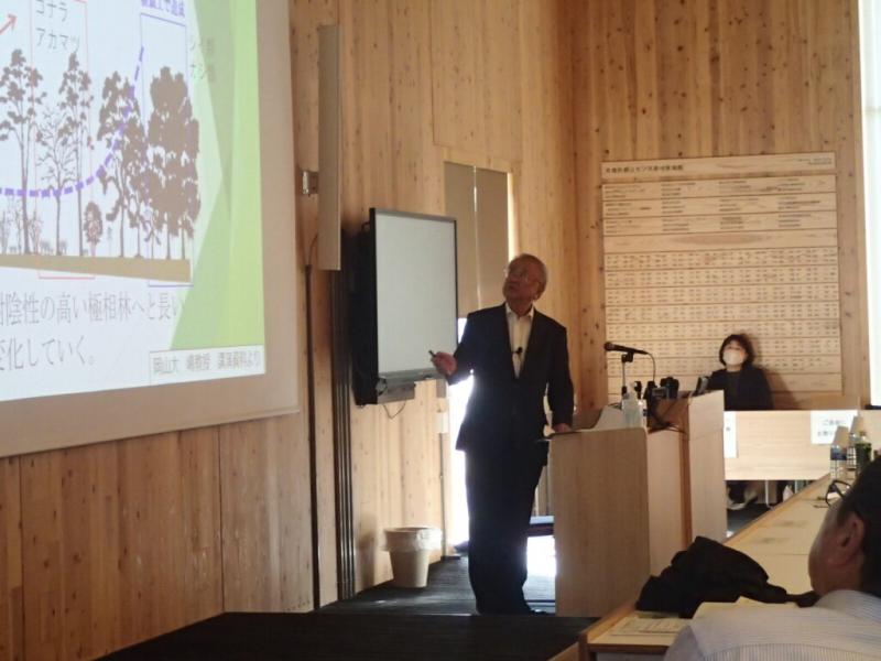 講演会では、本学環境生命自然科学研究科教授 嶋一徹氏、公益社団法人おかやまの森整備公社専務理事(元岡山県農林水産部治山課長 技術士(森林) 武田保氏、日本植生株式会社営業本部(設計担当)参事 小竹守敏彦氏、岡山県農林水産部治山課課長 井上昌則氏が登壇。今春岡山県で発生した山林火災では広範囲の山林を焼損しました。大規模山林火災が起こる背景と歴史、復旧に向けての取り組み、最新の緑化技術等について、学術、企業、行政それぞれの立場から、具体例を交えた説明および紹介がなされました。続く総合討論では、学生や高校生、一般の方との意見交換から、様々な疑問、提案、要望などが示されて意義深いディスカッションとなりました。