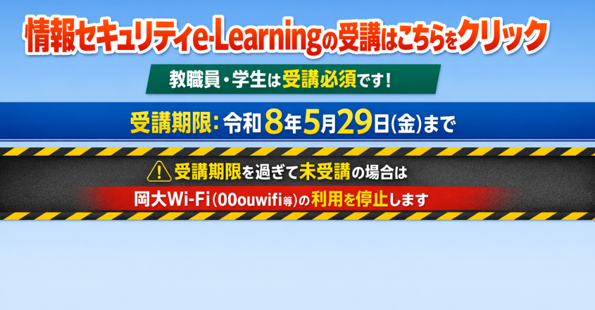- 2025年06月16日ニュース令和7年度情報セキュリティe-Learning未受講の教職員の方へ (6月中旬以降学内ネットワークへの接続ができない方へ)