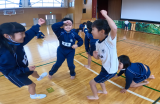 | 単元名「FUZOKU HERO'S BATTLE」第4学年 表現運動(リズムダンス) ○その場を盛り上げるにはどのようにすればよいかな。 リズムの特徴や友達の踊りの出方に応じて,動きの順序や動きそのものを工夫するなど,変化を付けながら即興的に踊り合う過程の中で,リズムに乗って全身で踊る姿を目指しました。