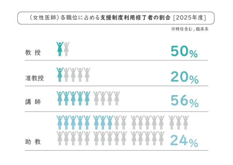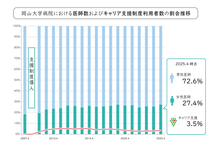 岡山大学病院では,2008年度より,妊娠・育児等により通常勤務が困難な医師を対象に,柔軟な勤務形態を選択できる「女性医師支援制度」の運用を開始しました。その後,利用対象を男性へも広げ,対象を男性医師にも拡大するとともに,不妊不育治療や介護なども利用理由に加え,「キャリア支援制度」として継続しています。2025年度末までの本制度の利用者は200名を超え,着実に実績を積み重ねてきました。岡山大学病院における女性医師(臨床系)の割合は,2007年度の18.4%から2025年度には27.4%へと上昇している中で,2025年度における上位役職者(特任を含む)の状況を見ると,助教33名(うち制度利用経験者8名),講師9名(同5名),准教授5名(同1名),教授2名(同1名)となっており,制度を利用しながらキャリア形成を継続している実態が確認されます。