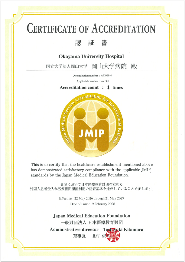 本院は,平成29年5月22日付けで一般財団法人日本医療教育財団による「外国人患者受入れ医療機関認証制度(JMIP)」に認定されました。